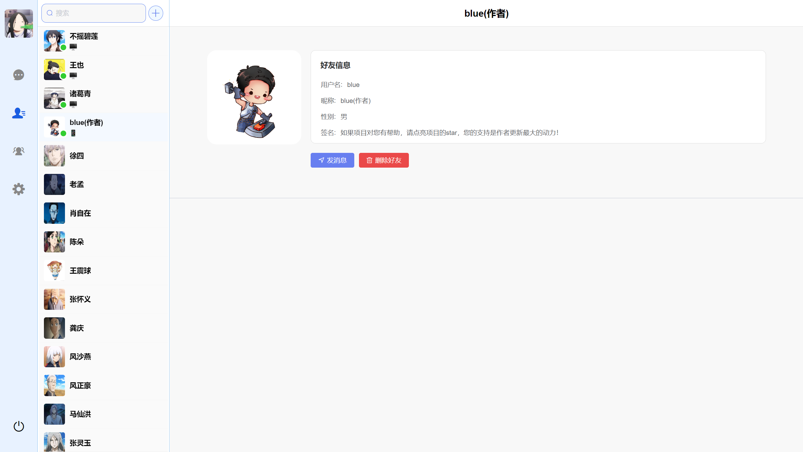 • 后台管理端上线,后台管理代码仓库地址:https://gitee.com/bluexsx/box-im-admin